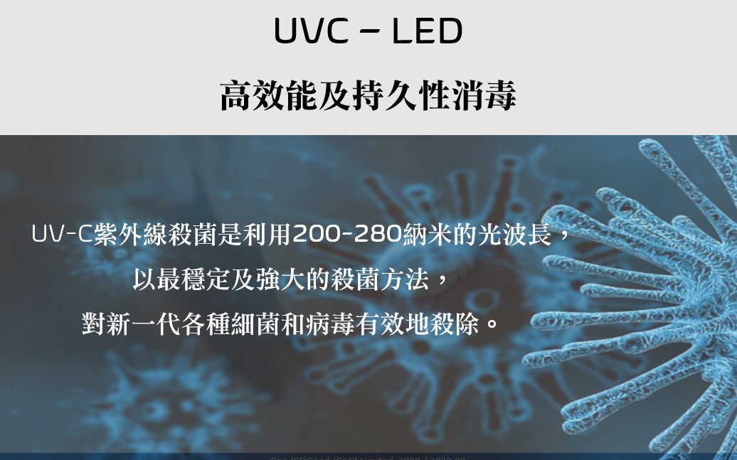 UV-C紫外線殺菌是利用200-280納米的光波長,以最穩定及強大的殺菌方法,對新一代各種細菌和病毒有效地殺除。