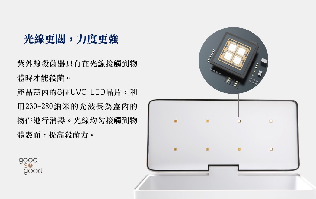 BODY LABS UVC 消毒殺菌盒蓋內的8個UVC LED晶片,利用260-280納米的光波長為盒內的物件進行消毒。光線均勻接觸到物體表面,提高殺菌力。