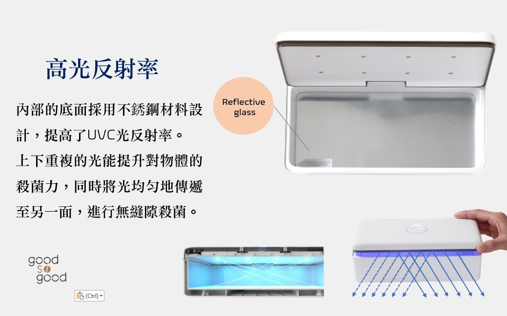 上下重複的光能提升對物體的殺菌力,同時將光均勻地傳遞至另一面,進行無縫隙殺菌。