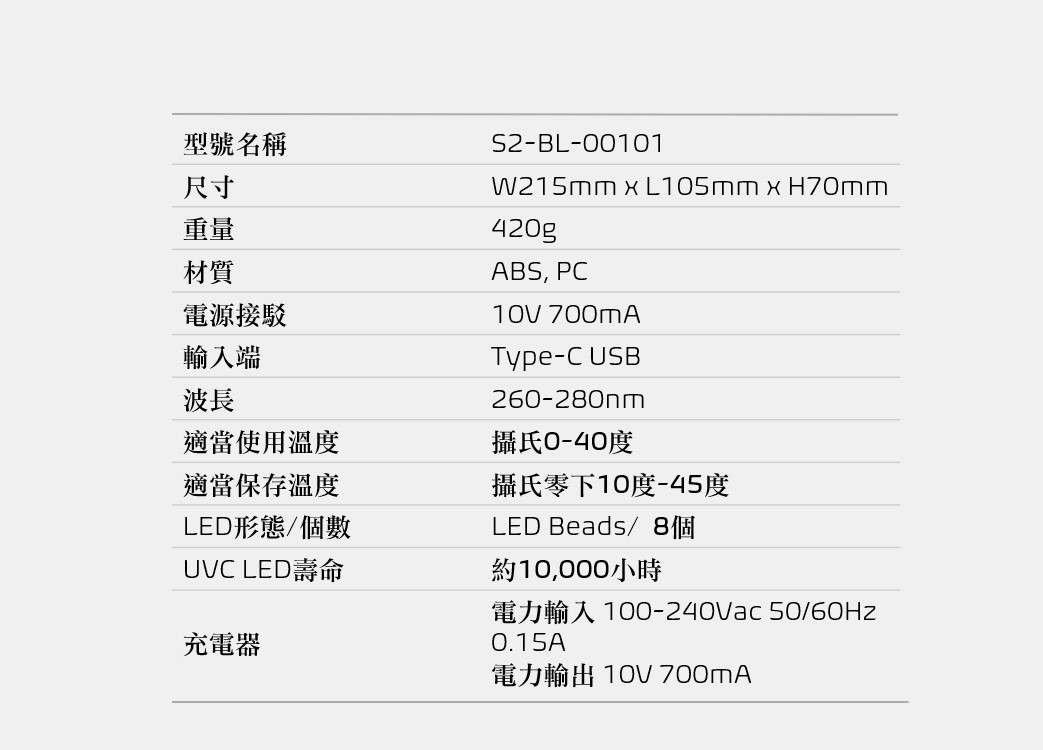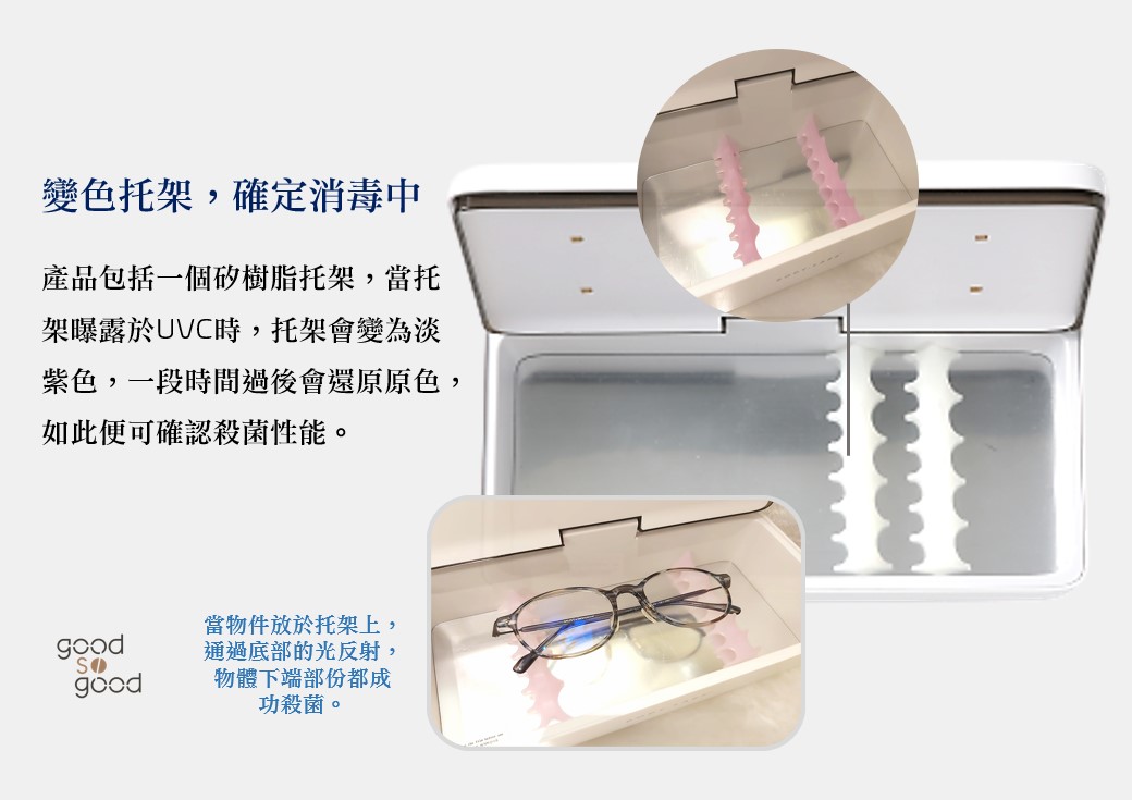 產品包括一個矽樹脂托架,當托架曝露於UVC時,托架會變為淡紫色,一段時間過後會還原原色,如此便可確認殺菌性能。