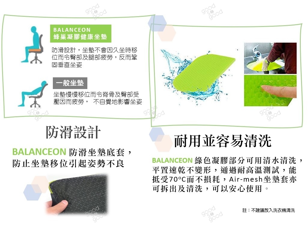 BALANCEON 防滑坐墊底套,防止坐墊移位引起姿勢不良。綠色凝膠部分可用清水清洗,速乾不變形,Air-mesh坐墊套亦可拆出及清洗;通過耐高溫測試, 能抵受70oC而不會變形和損耗 ,可以安心使用。