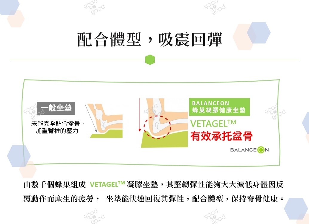 韓國蜂巢凝膠健康坐墊,採用專利雙層高彈性 VETAGELTM 凝膠蜂巢的結構,充分分散壓力,促進坐著時的血液循環。耐壓技術的概念,符合人體工學設計之餘,並且高度透氣,讓您久坐仍保持舒適健康。相比一般乳膠坐墊或記憶海綿坐墊,BALANCEON 蜂巢凝膠健康坐墊無論在承托力、吸震、回彈各方面,表現更超卓,更能保障使用者的脊骨健康和久坐時仍保持舒適感。