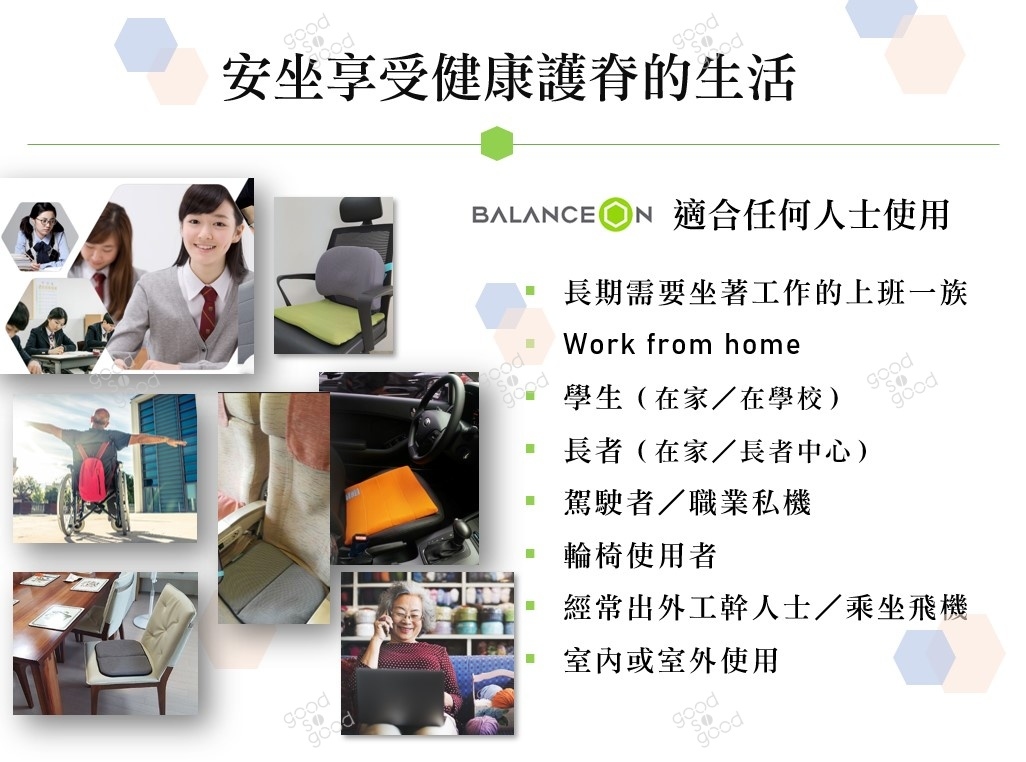 BALANCEON 防滑坐墊底套,防止坐墊移位引起姿勢不良。綠色凝膠部分可用清水清洗,速乾不變形,Air-mesh坐墊套亦可拆出及清洗;通過耐高溫測試, 能抵受70oC而不會變形和損耗 ,可以安心使用。